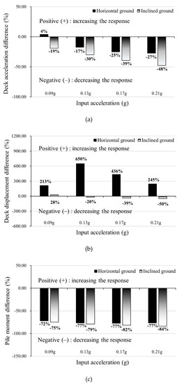 The differences in the system responses were derived to evaluate the performance of the batter piles according to the ground slope. The bar graphs in Figure 14 express the change in system response according to the installation of the batter piles. A negative value indicates that the batter piles decreased the response, while a positive value indicates an increased response.