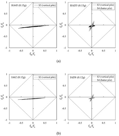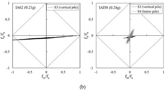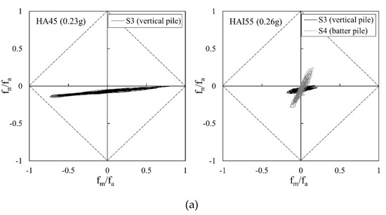 Figure 16 shows the time history responses when a low input acceleration (0.12–0.15 g) was applied. The plots for the horizontal (Figure 16a) and inclined (Figure 16b) ground models are slightly below the x-axis as the load on the deck plate acts as the axial stress. In the HA45 model, that is composed of vertical piles, as seen in Figure 16a, the bending stress ratio (fm/fa) is relatively large compared with the axial stress ratio (fn/fa). This model’s derived maximum bending stress ratio and axial stress ratio were 0.67 and 0.15, respectively. The bending stress ratio for the vertical piles (0.14) was greatly reduced for Model HAI55, with the batter piles, the axial force ratio of which was 0.27. The inclined-ground models showed similar trends in Figure 16b because batter piles transmit a lateral earthquake load as an axial force, thereby reducing the moment generated in the pile.