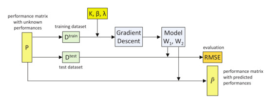 The prediction methodology follows three steps, according to the model described in [6], similar to the well-known Probabilistic Matrix Factorization (PMF) model [36]. First, we find the best parameters for and in the learning phase, through , by measuring the differences between real and predicted values. Next, we check the validity of the model by predicting the values of and calculating the difference from the real values. Last, we calculate the unknown values of P from the optimal model (that with minimum ). This process is summarized in Figure 1.