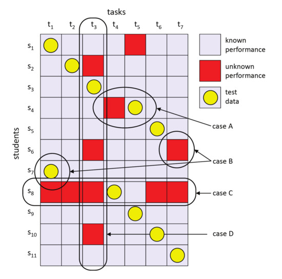 Second, we build the test dataset by selecting one performance value by each student (row) for consecutive tasks (columns). Figure 2 shows an example of this strategy. When the selected test performance is an unknown value, we skip to the next column of the same row (Case A in the figure) unless the end of the row has been reached, in which case, we select the first column of the next row (Case B in the figure). It is important to note that test data must be known data. By following this procedure, we make sure that the test data factor in all the students and all the tasks proportionately.