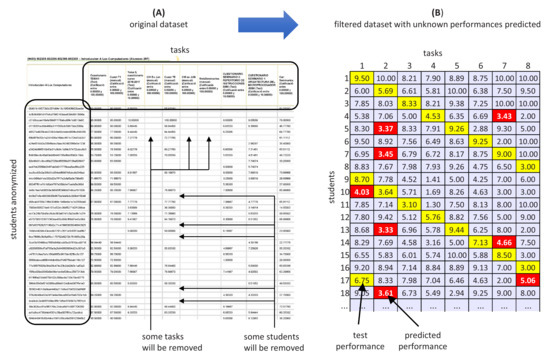 After applying the corresponding filters, we obtain the final performance matrix, a piece of which can be seen at the bottom of (B). Now, the dataset is reduced to 95 students and five tasks that meet and of the minimum academic activity, respectively. The performance matrix contains 475 values, and eighteen of them are unknown. The training and test datasets have 457 and 92 scores respectively, according to the building rules considered in Section 3.2. In this figure, the cells show performance values from zero to 10, and black and gray cells represent unknown and test scores, respectively.