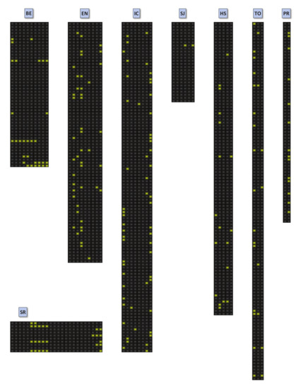 Table 2 shows the datasets corresponding to eight virtual classrooms. It lists the number of students (S), tasks (I), the performance matrix (P) before (original data) and after (filtered data) the filtering process, the number of known () and unknown () performances, the sizes of the training () and test () datasets, and the percentages of the minimum activity levels for students and tasks allowed by the filtering method. Besides, we can see in Figure 6 the variety of shapes and of the eight datasets. The number and location of the unknown performances are highlighted. This variety of features allows the algorithms to demonstrate their effectiveness in different scenarios.