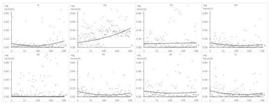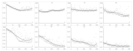 Figure 7, Figure 8 and Figure 9 show the results of , , and , respectively, obtained after applying GAK for each value of K from two to 200, considering the eight datasets described in the previous section.