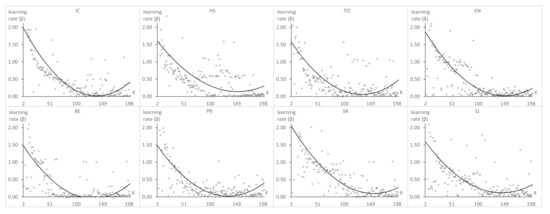 A new parameter appears in (8) and (9): the learning rate , which is a positive real number, usually in the range . This parameter affects the convergence of the algorithm. Therefore, several techniques were used to select the best value dynamically [38,39].