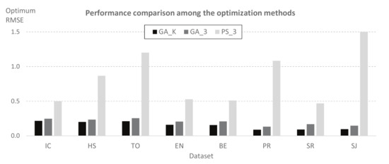 As we applied three optimization methods for solving the PSP problem, we can analyze the performance of these methods by comparing the minimum found for each dataset. Figure 10 shows the optimal values of collected from Table 3, Table 4 and Table 5. We check that the GAK method outperforms the prediction accuracy provided by GA3 and PS3 for all the datasets considered. In other words, including K as a third optimization parameter in GA and PS does not improve the prediction accuracy. Furthermore, we can also conclude that GA provides better results than PS, regardless of whether we consider K as an optimization parameter.