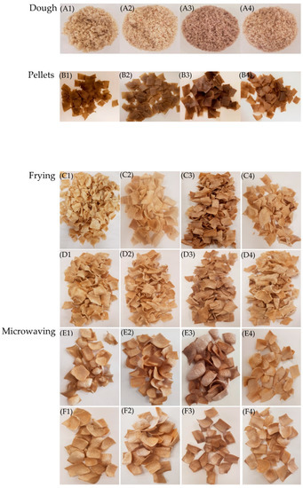 Processing of the obtainment of Jerusalem artichoke snacks. (A)—dough: (A1)—no fruit powder addition, (A2)—cranberry powder addition, (A3)—chokeberry powder addition, (A4)—blackcurrant powder addition; (B)—pellets: (B1)—no fruit powder addition, (B2)—cranberry powder addition, (B3)—chokeberry powder addition, (B4)—blackcurrant powder addition; Frying: (C)—0 days of storage and (D)—5 weeks of storage, (C1,D1)—no fruit powder addition, (C2,D2)—cranberry powder addition, (C3,D3)—chokeberry powder addition, (C4,D4)—blackcurrant powder addition; Microwaving: (E)—0 days of storage and (F)—5 weeks of storage, (E1,F1)—no fruit powder addition, (E2,F2)—cranberry powder addition, (E3,F3)—chokeberry powder addition, (E4,F4)—blackcurrant powder addition.