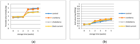 Changes of (a) peroxide value and (b) acid value of the fat extracted from the fried snacks during storage for 5 weeks.