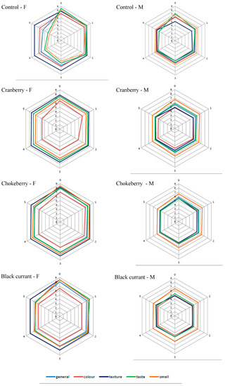 Newly designed products should have appropriate sensory features. The appearance, colour, taste, aroma and texture are particularly important quality distinguishing features in relation to snacks. These attributes depend on the additives added to the recipe as well as on technological parameters such as the expansion method. Fried snacks, independently on recipe, were higher evaluated as fresh products. Taste and smell as well as texture of snacks were more accepted when frying in oil was chosen as expansion method in comparison with microwaving. Visual aspects (Figure 1) also influenced the acceptability of ready to eat snacks. Fried snacks exhibited more delicate texture and were more wavy, while microwaved were more expanded with characteristic puffing effects. There were also observed differences in colour—especially influenced by the kind of fruit powder added. The most intensive colour had snacks with chokeberry powder addition and it was highly rated. However, during storage, because of oil deterioration mostly connected with oxidative changes, fried snacks lost their acceptability much faster than snacks with low fat content. Such phenomenon was observed according to control snacks as well as with cranberry powder addition, where peroxide value increased with a higher ratio (Figure 3) than in snacks with the addition of chokeberry and black currant powders. It can be explained by the different polyphenol composition of fruit powders and better antioxidant efficiency of compounds in chokeberry and black currant.