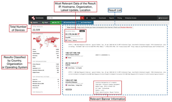 Finally, it is worth mentioning that there is a specific area on Shodan’s webpage for detecting multiple ICSs [67]. In fact, different researchers have previously warned on the existence of numerous ICSs, Supervisory Control and Data Acquisition (SCADA) systems and PLCs exposed on the Internet and that can be easily discovered with Shodan [68,69,70,71,72]. In addition, Shodan has been used for detecting CPSs [73] or smart healthcare devices [74], thus demonstrating that little effort is required to detect critical IIoT devices and exposed Industry 4.0 services.