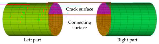 where the superscript “s” denotes the objects regarding the shaft. As the reaction forces on the connecting surfaces between the two parts are equal but opposite in sign, the force vector will no longer exist in Equation (4). Whereas, the nodal displacements of the two crack surfaces are both retained, so the force vector are retained and will be used to apply the penalty contact force in the following part. Although Figure 1 illustrates a transverse crack, this approach can be used for other kinds of cracks, such as the slant and elliptical in shaft, as well as the gapless cracks in other structures.