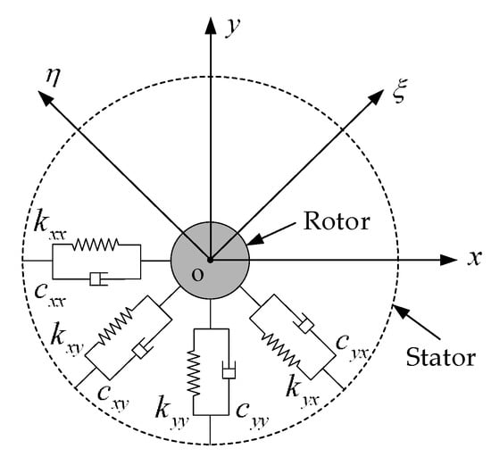 where and are the stiffness and damping coefficients; and represent the transverse displacements. When the speed-dependent characteristic is considered, the eight coefficients are depending on the rotating speed.