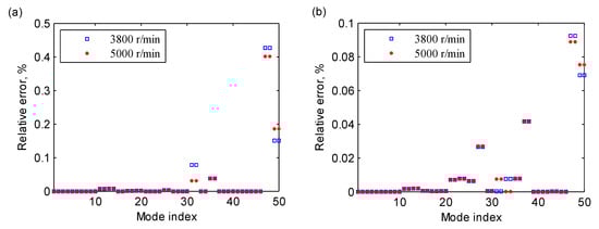 The relative errors of the first 50 damped eigenvalues of the anisotropic rotor-bearing system with a 20-mm crack at the speeds of 3800 and 5000 r/min: (a) the real parts, (b) the imaginary parts.