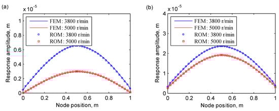 The response amplitudes of nodes on shaft axis of the rotor-bearing system with a 20-mm crack at the speeds of 3800 and 5000 r/min: (a) along the horizontal direction; (b) along the vertical direction. The labels “FEM” and “ROM” denote the full order model and the reduced order model, respectively.