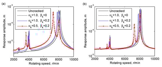 Figure 13 shows the Campbell diagrams of the speed-dependent cases with and , respectively. This figure is illustrated to show the effects of the anisotropy in the stiffness coefficient. It can be seen that the anisotropy of bearings leads to relatively obvious changes in the natural frequencies of higher orders. Consequently, the 2×, 3× and higher order critical speeds will be affected. Therefore, it can be concluded that the speed-dependent characteristic of bearings can also significantly affect the dynamic response of a cracked rotor-bearing system, and it should be carefully taken into consideration to accurately investigate the vibration of cracked rotor-bearing systems.
