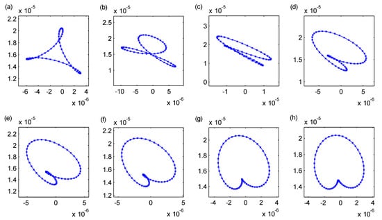The evolution of orbits of the central node versus the anisotropic parameters of principle stiffness coefficient at the speed of 3800 r/min: (a) ; (b) ; (c) ; (d) ; (e) ; (f) ; (g) ; (h) .