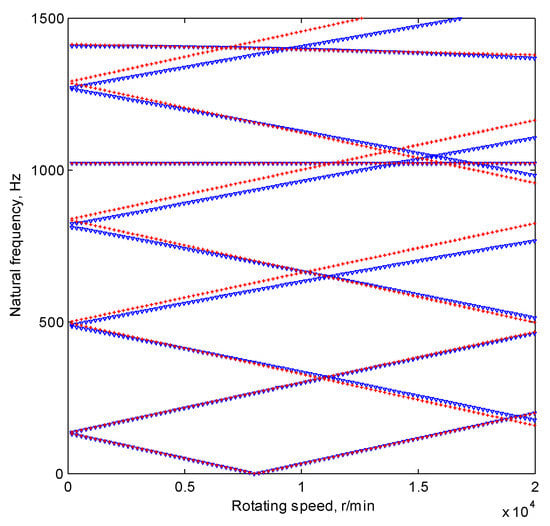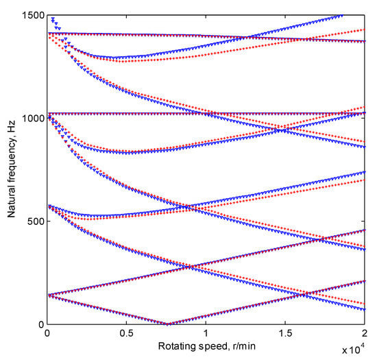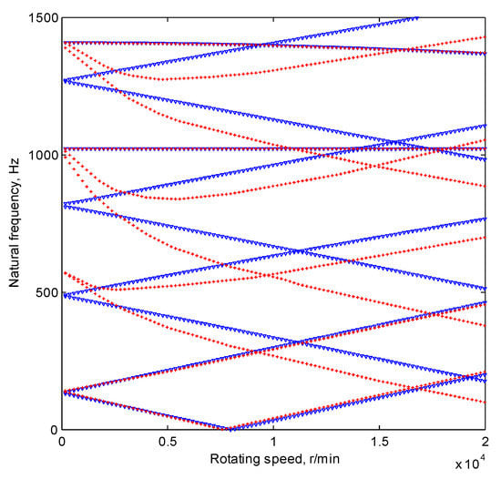 As is illustrated in the figure, the anisotropy of bearings mainly affects the eigenvalues of relatively high orders, and the first pair of natural frequencies and the torsional natural frequencies is almost unaffected. With respect to the second and the higher order natural frequencies, the differences between the two cases are relatively obvious. Therefore, the high-order critical speeds will be obviously influenced. These phenomena depend on the characteristics of the mode shapes. The first-order mode shapes of the system tend to be bowed, whereas the high-order ones often involve complex bending deflections. The regions adjacent to the bearing nodes are more likely to participate in the deflection in the high-order modes, and then the high-order natural frequencies are more sensitive to the change of the system’s parameters.