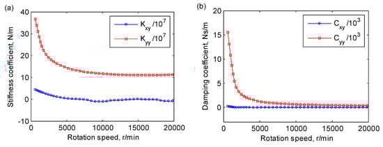 The speed-dependent coefficients of a journal bearings versus the rotating speed: (a) stiffness coefficients, (b) damping coefficients.