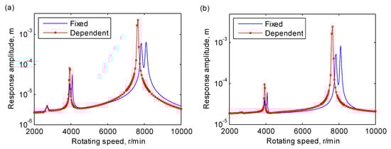 The response amplitudes of the central node of the cracked anisotropic rotor-bearing system with fixed and speed-dependent coefficients: (a) along the horizontal direction; (b) along the vertical direction. The parameter of both cases equals 1.0, and the parameter of the fixed case is 0.2.
