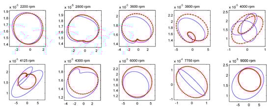 The abovementioned characteristics will also be reflected in the whirling orbits. Figure 11 shows the orbits of the central node of the fixed and the speed-dependent cases at ten typical rotating speeds. It can be seen in the figures that the evolution characteristics of the orbits are similar to the variation of response amplitudes. At low rotating speeds, the orbits of the two cases are very similar in shape and size, as the first three figures show. When the rotating speed is within the resonant region of the 1/2 critical speed, such as the speed of 3800, 4000, 4125 and 4300 rpm, the orbits become obviously different, not only in the shape but also in the size. After passing through the resonant region, the orbits are both gradually turning into circular shape, until the speed reaches the resonant region of the 1× critical speed, at which the orbits become elliptical shapes.