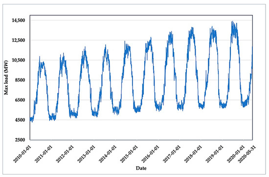 A dataset of the maximum load of Kuwait between January 2010 and May 2020 was acquired from the Ministry of Electricity and Water (MEW) to support this research. Figure 1 presents the maximum load (MW) of Kuwait for the past ten years. With reference to Figure 1, a yearly seasonality of the maximum load can be clearly observed. The maximum load peaks are within the summer period between June and August each year due to the subtropical weather nature of Kuwait with extreme temperatures in summer and cold winter seasons. In addition, the maximum load takes an increasing trend. The gradual and steady trend increase is likely to continue for the upcoming years due to the fact of the increasing population, increased factories, and the expansion of the urban and residential areas.
