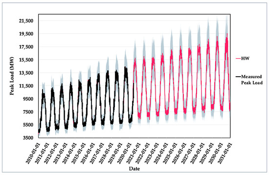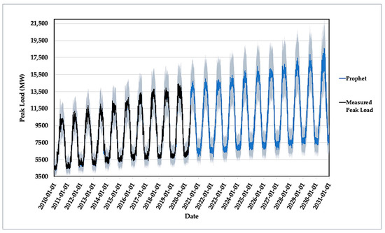 The Prophet and Holt–Winters models are implemented in R and Python, using real data of electrical daily peak load from Kuwaiti powerplants from 2010 to 2020. The two models’ outputs are plotted in Figure 4 and Figure 5, along with the real electrical peak of daily loads. The data include Kuwait’s peak loads from 2010 to 2020. Moreover, the forecasted from 2020 to 2030, along with a 99% confidence interval, are included. The forecasted region of this period is enlarged and presented in Figure 6, along with the 99% confidence interval for both models.