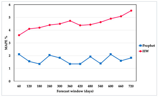Another measure to assess the accuracy of the models is to use the simulated historical forecast (SHF) [22,37], as depicted in Figure 8. The Prophet model forecasts have a considerably lower prediction error than the Holt–Winters model. The Prophet model’s MAPE values are limited within the range between 1.3 and 2.1 approximately, and there is no clear trend of MAPE with the forecast window. The MAPE values of the Holt–Winters model across the different forecasting periods were generally good but higher than the Prophet model. The Holt–Winters model showed a generally increasing trend of MAPE values with the increase in the forecast horizon. These results are evidence that both models exhibit a great extent of accuracy in long-term energy forecasting.