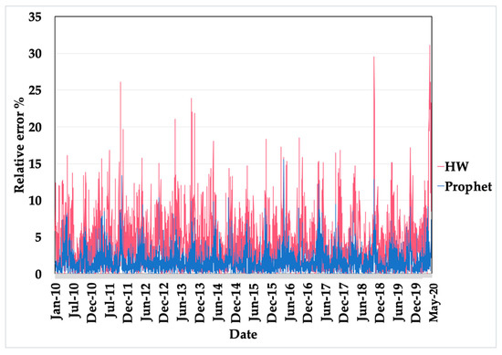 The model’s generalization is assessed by the model’s ability to forecast samples beyond the training range. Figure 9 depicts the relative error variation in each of the Prophet and Holt–Winters models. The relative error percentage of the Prophet model outperforms the Holt–Winters model. The percentage of maximum relative error in the Prophet model is less than 16%, whereas the Holt–Winters model’s relative error reached 30%. Besides, the SHF results can be used to show the generalizability of both models. The Prophet model shows better generalizability than the Holt–Winters model, as suggested by the MAPE values and the relative error percentage.