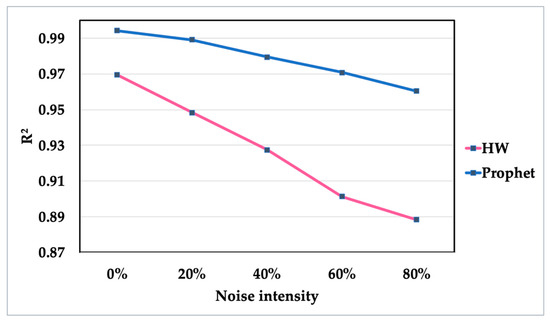 A reduction in the coefficient of determination is associated with the increase in the noise level, as depicted in Figure 10. The Prophet model showed high R2 values across the different noise intensities with a minimum value of 0.9604 at 80% noise intensity. On the other hand, the Holt–Winters model showed high values of R2 but relatively lower than the Prophet model. The minimum value of R2 for Holt–Winters was 0.8883 at 80% noise intensity. The results indicate that the Prophet model is more robust than the Holt–Winters model under various Gaussian white noise intensities.