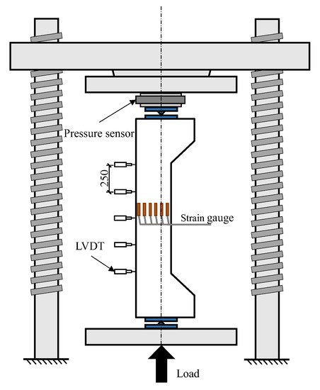 Five electronic displacement meters were evenly arranged along the height of the specimen, at 250 mm intervals, as depicted in Figure 2. Steel strain gauges were placed on the longitudinal reinforcement along the height of the column. Six concrete strain gauges were placed on the concrete surface of the column at 0, 50, 100, 150, 225, and 300 mm from the edge of the section.