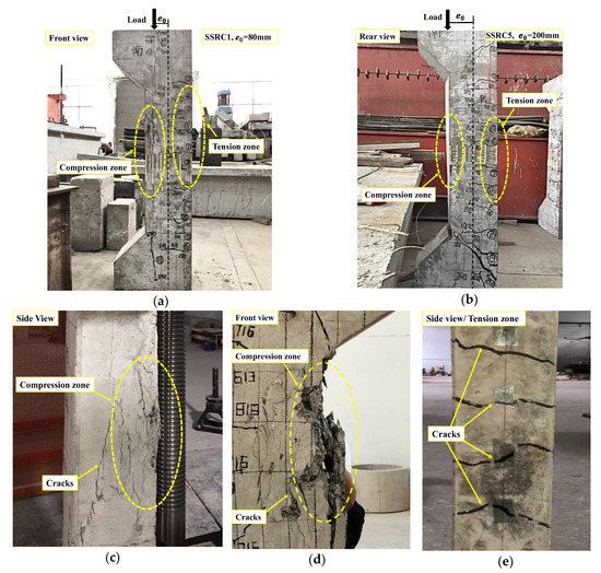 Typical failure modes for specimens: (a) small eccentric compression, (b) large eccentric compression, (c) side view, (d) compression side, and (e) tension side.