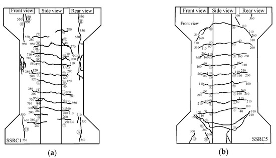 The typical failure and crack development patterns caused by the eccentric loading of the columns are depicted in Figure 3 and Figure 4. Specimens SSRC1, SSRC3, SSRC4, and SSRC7 were loaded under small-eccentricity loads. At 20% of the ultimate load, 3–4 transverse cracks appeared in the tension zone. At 30–50% of the ultimate load, the number of cracks increased gradually, and the lengths and widths of existing cracks developed slowly. At 50% of the ultimate load, longitudinal cracks appeared in the compression zone. At 90% of the ultimate load, the transverse crack extended to the neutral axis of the test column, the crack width became larger, and the lateral displacement continued to increase. When the ultimate load was reached, the test column produced a crisp noise, and many longitudinal cracks appeared in the compression zone. The load dropped rapidly when the lateral displacement increased.