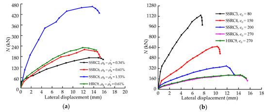 Load–lateral displacement curves for various (a) reinforcement ratios and (b) eccentricities.