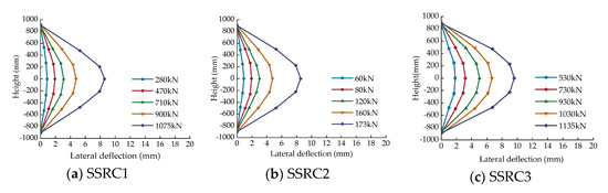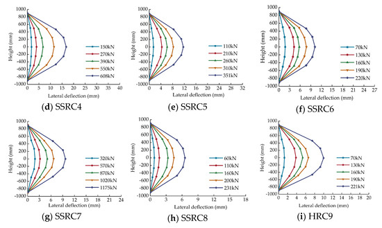 The lateral deflection curves of all specimens under various loads are displayed in Figure 6. The lateral displacement curves of the eccentric compression specimens are symmetrically distributed along the middle of the columns and are approximately sinusoidal. The maximum lateral displacement occurs in the middle of the test column. Under the same eccentricity, the reinforcement ratio had a negligible effect on the lateral displacement corresponding to the ultimate load. The specimens SSRC3, SSRC4, SSRC5, and SSRC6 have the same reinforcement and increasing eccentricity; as the eccentricity increases, the ultimate load decreases. As the eccentricity increases, the lateral deflection at maximum load increases for columns SSRC3 and SSRC4 (reaching approximately 10 and 17 mm, respectively) and begins to decrease for columns SSRC5 and SSRC6 (reaching approximately 12 and 10 mm, respectively).This effect may be due to the axle being applied to the corbel.