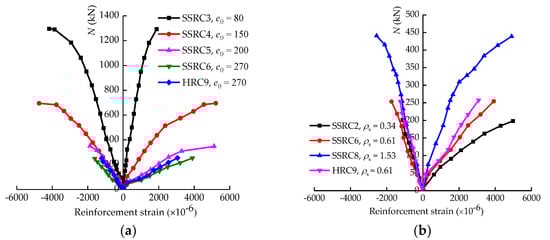 The load–reinforcement strain curves under various eccentricity values are depicted in Figure 7a. With the same reinforcement ratio, the ultimate load increases as the initial eccentricity of the specimen decreases. Under the same load, the tensile reinforcement strain of SSRC6 is always greater than that of HRC9. The load–reinforcement strain curves under various reinforcement ratios with the same eccentricity are depicted in Figure 7b. Under the same level of load, the reinforcement strain of large eccentric specimens decreases with an increase in reinforcement ratio.