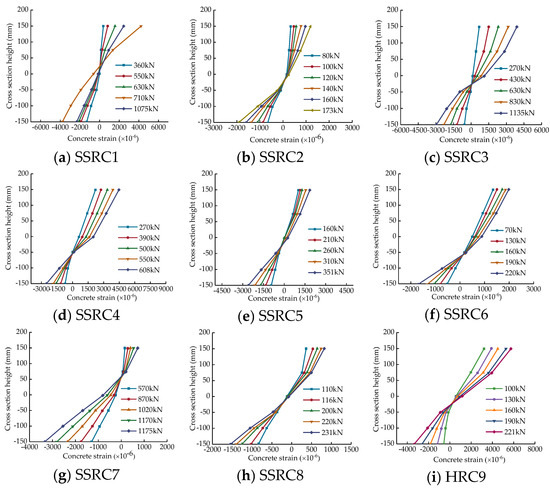 Figure 8 exhibits the concrete strain distribution at the midspan sections of the specimens under various loads. As the load increased, the neutral axis of the transverse section moved to the compression side. When damaged, the concrete strain changed suddenly owing to the sharp deformation of the cross section. It is evident from Figure 8 that the concrete strain in the midspan section is approximately linearly distributed before destruction, which means that the deformation of the specimen section conforms to the assumption of the plan section.