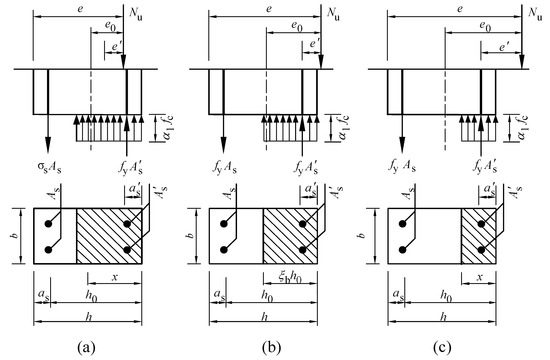 Calculation diagram for stainless-steel-reinforced concrete (SSRC) columns subjected to eccentric load: (a) small eccentricity, (b) limiting eccentricity, and (c) large eccentricity.