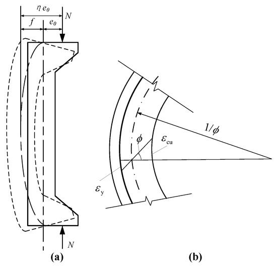 where ϕ is the sectional curvature at failure, as seen in Figure 10b. The relationship among concrete strain εcu, reinforcement strain εy, and ϕ can be denoted as follows: