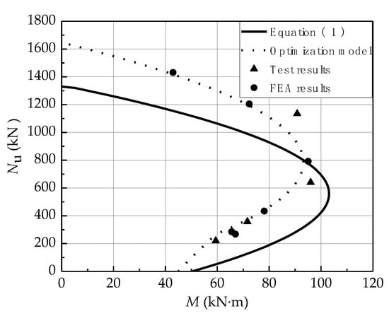 The ultimate load–bending moment (Nu–M) curves of SSRC columns can be calculated using Equation (1) and the optimization model. For fc = 20.1 MPa and AS = A′S = 30 mm2, the Nu–M curves for various eccentricities are depicted in Figure 11. The Nu–M curve of the optimization model is consistent with the test and FEA results, and the predicted results always remain safe. In addition, these results indicate that the mechanical properties of SSRC columns perform better when the relative eccentricity is smaller.