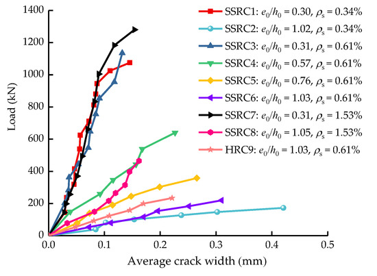 The ultimate load–average crack curves of specimens are depicted in Figure 12. The average crack widths of the SSRC columns at failure were between 0.13 and 0.42 mm. Under the same eccentricity, the average crack width increased with a decrease in the reinforcement ratio. For the SSRC columns under small eccentric compression, the change in the reinforcement ratio has a negligible effect on the crack development when compared with the eccentricity. In addition, the development of the crack widths is similar for SSRC6 and HRC9 under the same conditions.