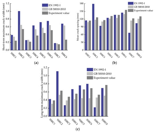 The calculated and experimental values of the long-term maximum crack widths are compared in Figure 13c. Based on EN1992-1 and GB 50010-2010, the long-term maximum crack widths of eight SSRC columns under eccentric compression are calculated. The average values of obtained using EN1992-1 and GB 50010-2010 are 1.169 and 1.341, and the variation coefficients are 0.229 and 0.201, respectively. The calculation results of using EN1992-1 are always safe; however, the results do not satisfactorily comply with wmax,l. The calculation result of using GB 50010-2010 is less than wmax,l; however, it has a better correlation with wmax,l.