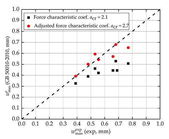 As is evident in Figure 13a, both codes give accurate predictions when calculating the maximum crack width for the short-term load. The average ratio of the measured maximum crack width (wmax,s) to the short-term maximum crack width () calculated by EN1992-1 is 0.685, and the variation coefficient is 0.324. The average value of is 0.738, and the variation coefficient is 0.223.