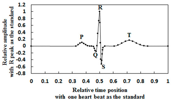 The ECG waveform and the normal range of the parameters were obtained from the literature [4,25]. Heart rate (HR): 60–100 bpm. P wave amplitude: 0.25 ± 0.05 mv. Interval: 110 ± 20 ms. QRS complex amplitude: 1.6 ± 0.5 mv. Interval: 100 ± 20 ms. R wave amplitude: 1.6 ± 0.5 mv. Q wave amplitude: 0.25 × R wave. T wave amplitude: 0.1–0.5 mv. Interval: 160 ms. According to the normal range of a heart beat, the reference heart beat model was established by taking the middle value. The dimensionless R peak and heart rate cycle were adjusted to obtain a dimensionless beat model, as shown in Figure 1.