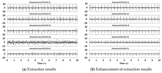 The MECG residue is included in in addition to other noise, which affects the morphology of the FECG significantly and the clarity of the QRS complex, as shown in Figure 2a. In order to eliminate these residues, we continue to apply the proposed method above to extract the FECG from and denote it by . If is taken as the final extraction result (clear FECG), we will lose the nonlinear and nonstationary characteristics of the FECG. For this reason, in this paper, the MECG residue is eliminated using the threshold method after the extraction of and then superimposed with so as to enhance the FECG and recover the nonlinear, nonstationary characteristics (see Figure 2b).