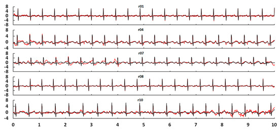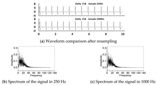 In the literature [28], a standard heart model based on a single dipole vector was utilised to simulate MECGs and FECGs. Gaussian white noise was added to synthesise an abdominal signal. The open source toolkit FECGSYN [29,30] in the Open-Source Electrophysiological Toolbox (OSET) can also be used to simulate MECGs, FECGs, or non-invasive FECGs. Although the toolkit can be used to simulate signals of any parameters, it cannot fully simulate the nonlinear and nonstationary characteristics of the complex human body system. In this paper, we chose existing real databases to provide the basic data, such as abdominal and direct fetal ECG database (ADFECGDB) [31], non-invasive fetal ECG database (NIFECGDB) [32], database for the identification of systems (DaISy) [33], and HIT-BIH arrhythmia database (MIT-BIH) [34]. The direct scalp FECGs, thoracic MECGs and adult ECGs are preprocessed by filtering and eliminating baseline wandering before they can be used for synthesising abdominal signals. Table 1 lists the signals selected for this paper. Figure 4 shows the processed results of the direct scalp FECGs in the ADFECGDB database. The red line represents the original scalp FECG and the black line represents the processed FECG. The FECGs, after being preprocessed, should have complete QRS waveforms and accurate positions and amplitudes of R peaks, with smooth waveforms and clear P and T waves. In addition, the sampling frequency of ECG signals from the DaISy and MIT-BIH databases was different to that from ADFECGDB and NIFECGDB—250 and 360 Hz, respectively. For data synthesis, the sampling frequency should be uniformly increased to 1 kHz. Figure 5 shows a comparison of the waveform and spectrum before and after resampling of Ch8 in the DaISy database. Figure 6 shows the waveform and spectrum comparison before and after resampling of a103 in the MIT-BIH database. It can be seen that the waveform and the spectrum are consistent before and after resampling.