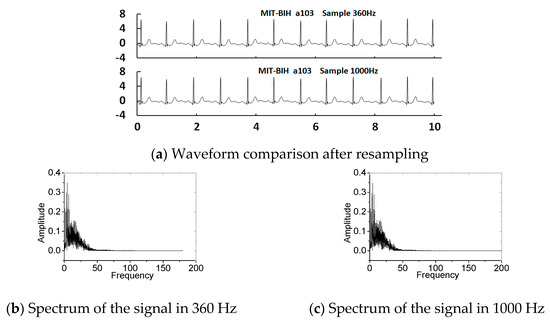 Waveform and spectrum before and after resampling of a103 in the MIT-BIH database.