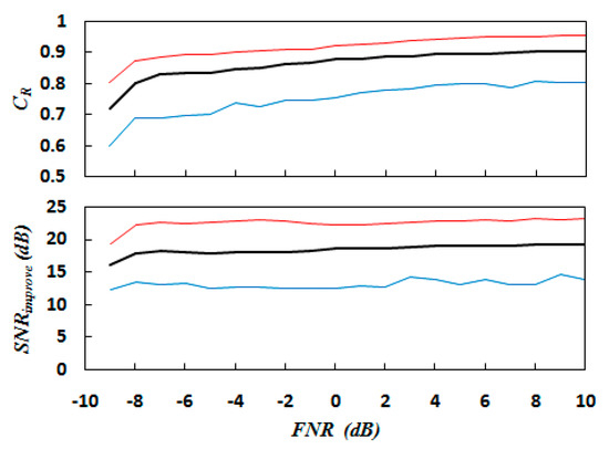 Correlation coefficient and signal–noise ratio (SNR) improvement results against the FECG to noise energy ratio (FNR) using the proposed method for 105 synthetic signals. The red, blue, and black lines present the maximum, minimum, and average values, respectively.