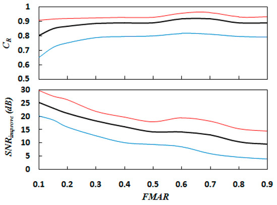 Correlation coefficient and SNR improvement results against the FECG and MECG amplitude ratio (FMAR) using the proposed method for 105 synthetic signals. The red, blue, and black lines present the maximum, minimum, and average values, respectively.