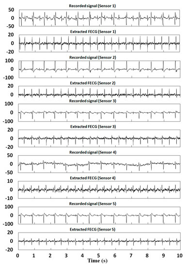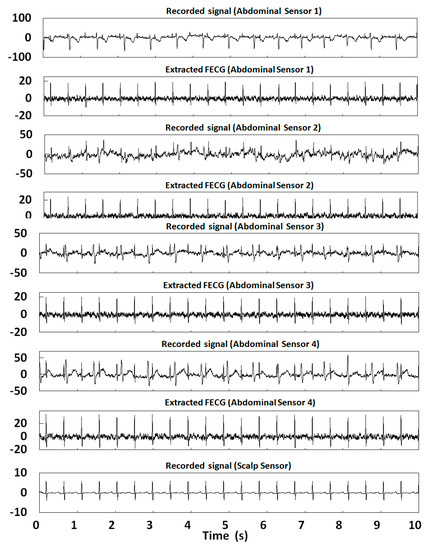 However, commonly, the FECG heart rate is between 120 and 180 bpm, and the MECG heart rate is between 60 and 100 bpm. The amplitude of the MECG is 5–10 times larger than that of the FECG [25,26,27]. Therefore, we think about the denoising in another way: For the MECG, the FECG can be treated as noise, and the MECG can be firstly extracted from the AECG based on the proposed method. Then, the MECG is subtracted from the AECG to get the FECG only mixed with noise, i.e., a noisy FECG.