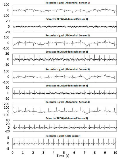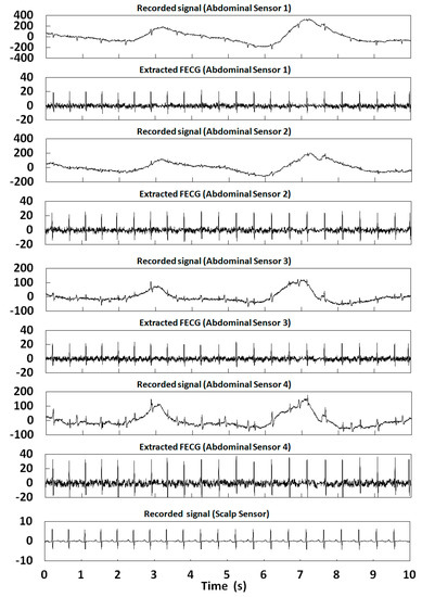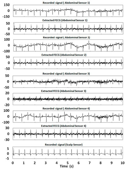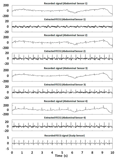 - Khamene, A.H.; Negahdaripoure, S. A new method for the extraction of fetal ECG from the composite abdominal signal. IEEE Trans. Biomed. Eng. 2000, 47, 507–516. [Google Scholar] [CrossRef]
