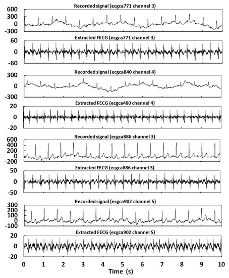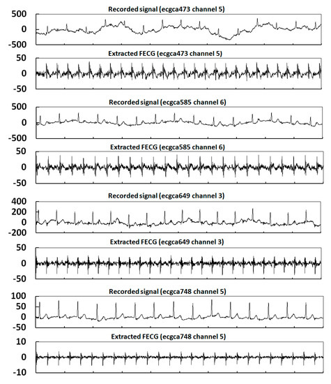 In order to further verify the effectiveness of FECG extraction at different pregnancy stages and channels by the proposed method, eight records were selected for experiments. These were ecgca473 Channel 5, ecgca585 Channel 6, ecgca649 Channel 3, ecgca748 Channel 5, ecgca771 Channel 3, ecgca840 Channel 4, ecgca886 Channel 3, and ecgca902 Channel 5. The experimental results are shown in Figure 17.
